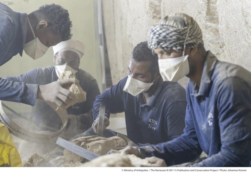Die Arbeiten der Winterkampagne fokussierten sich auf den mittleren Bereich der Grabkammer (Halle J) von KV 11 sowie die Konservierung der Wandmalereifragmente an der Nordwand. Über vier Monate hinweg arbeitete unser Team unermüdlich an der systematischen stratigrafischen Ergrabung und dem Erhalt dieses bedeutenden Areals. Mit Hilfe modernster Techniken und neu entwickelten Methoden war es uns schließlich möglich eine Vielzahl an Funden freizulegen und zu dokumentieren. Zudem gibt es nun neue Anhaltspunkte zur Verwendung jenes Bereiches in moderner Zeit und zur Ausrichtung des Sarkophagensembles von Ramses III. Unsere Forschungen und die Auswertung der Arbeiten schreiten weiter voran und werden unter anderem in den jährlichen Berichten beim Journal of the American Research Center in Egypt publiziert. Wir danken unseren Förderern, Sponsoren und Unterstützern für Ihre großartigen Beiträge zur Sicherung dieses einzigartigen Kulturgutes!
